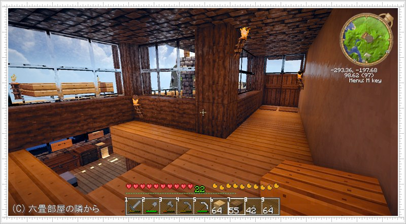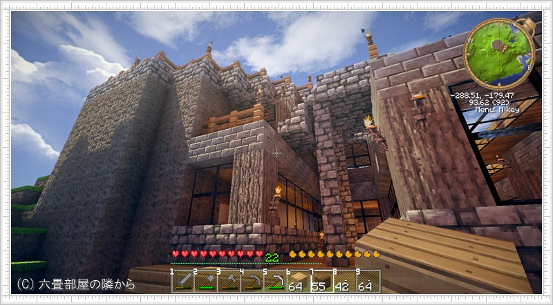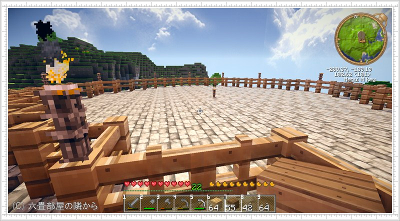 階段は、そのままだと注意浮いて不自然(Minecraft的には自然)なので、最近のアップデートで追加された石の塀を使用しています。