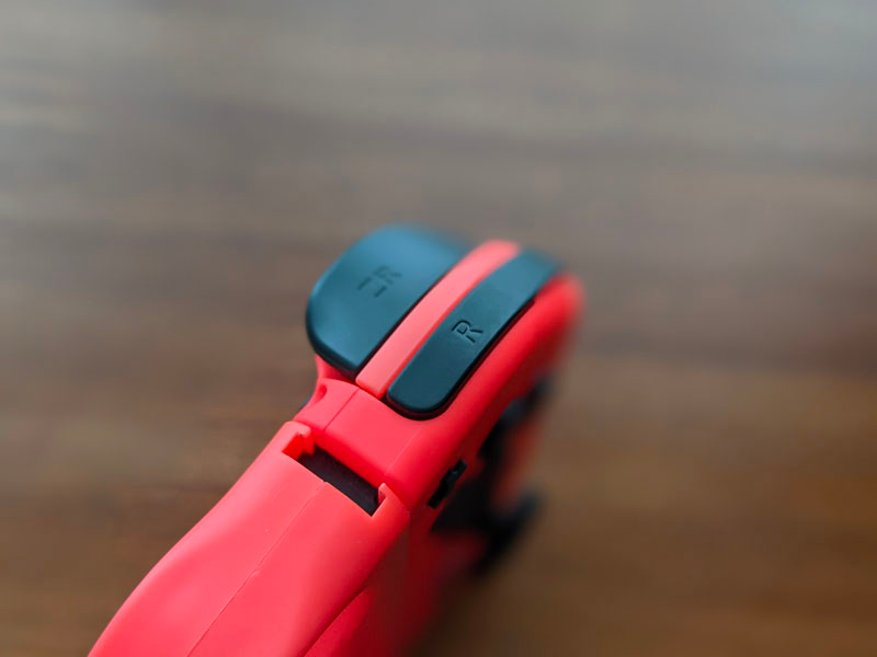 公式のストラップとの組み合わせでは、ロックが2箇所(ストラップ側の爪で引っ掛ける部分と、Joy-Con 側のボタンを押す部分)あるのですが、この商品ではグリップ側には何もついておらず、実質 Joy-Con 側のボタンのみがロックになります。